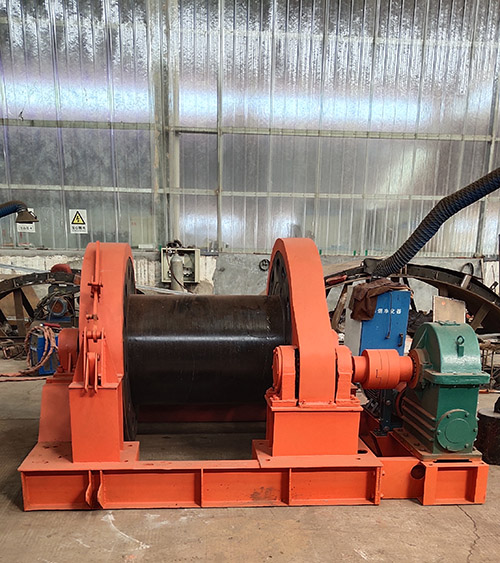 主軸裝置包括:主軸、齒輪、卷筒、制動輪、軸承座及軸承等。減速器是采用球面蝸輪副減速,加有變速齒輪。轉換變速手柄快慢速位置,可變換快慢兩種速度。工作制動器采用瓦塊式制動器,啟動電機,電動液壓推動器松閘。