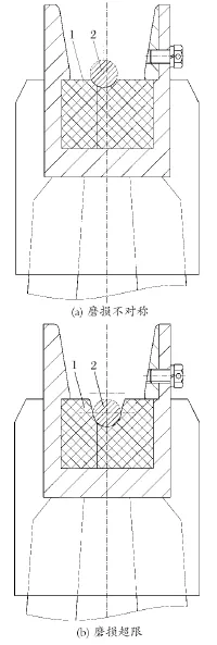 天輪裝置在返廠修復時,天輪襯墊磨損一般出現2 種情況 (見圖 9),襯墊磨損左右不對稱和襯墊深度方向磨損超限。分析其原因:襯墊左右磨損不對稱是因為天輪裝置與主軸裝置不對中所致;襯墊磨損嚴重直接原因是鋼絲繩與襯墊發生了相對運動,鋼絲繩打滑,輪緣偏擺較大也是原因之一。