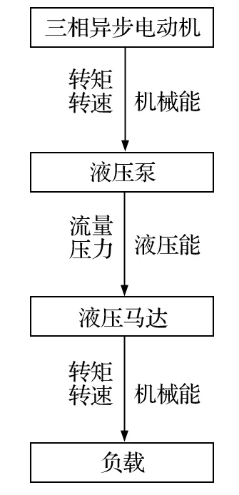 換繩機構采用雙液壓馬達驅動,以帶動同步帶輪和鏈輪轉動,進行送繩,其能量傳遞過程如圖3所示。在整個能量傳遞中,受排量、效率、液壓等因素的影響,液壓馬達輸出轉矩會產生波動。因此,需要通過公式推導得出輸出轉矩的波動函數。