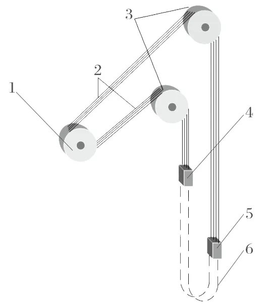 1.驅動裝置;2.鋼絲繩;3.天輪;4.罐籠;5.下方容器;6.尾繩。