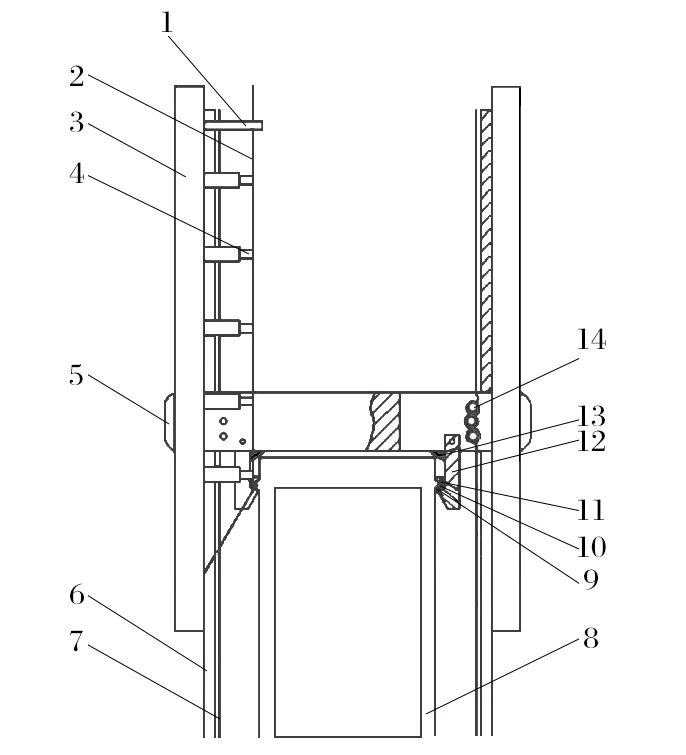 1.上支架;2.耐磨鋼帶;3.基礎;4.緩沖液壓缸組;5.水平支撐橫梁;6.立柱;7.鋼帶;8.罐籠;9.壓輥耳座;10.壓輥;11.托罐梁;12.托罐爪;13.彈簧;14.壓輥組。
