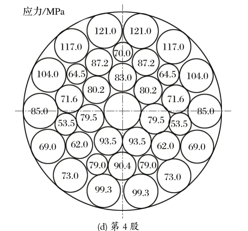 由圖4 可知,鋼絲繩第 1 至第 4 股內第 1 層至第3 層鋼絲的總體應力為 94.08、90.08、71.20 和 117.80 MPa。從圖中可以看出,鋼絲繩芯中 心軸的對稱軸位置處,第 1 股和第 4 股的鋼絲繩應力是沿著左右方向對稱分布的;右同向捻和右交互捻鋼絲繩靠近繩芯的位置彎曲應力較大。為了研究提升鋼絲繩的應力分布及分布規律,采用有限元分析法建立鋼絲繩物理模型并進行數值模擬,可以直觀得到鋼絲繩內部以及繩股之間的應力分布。